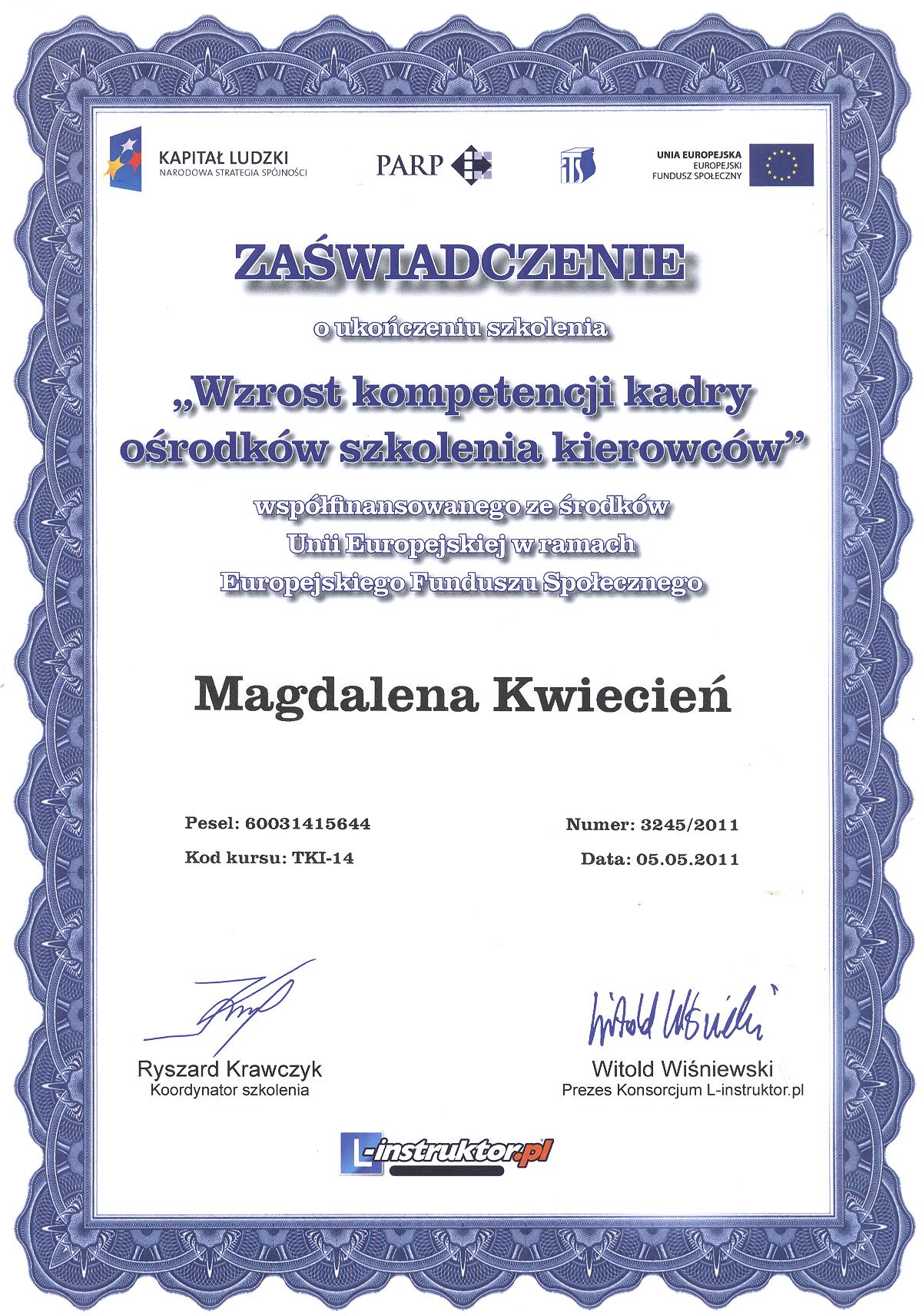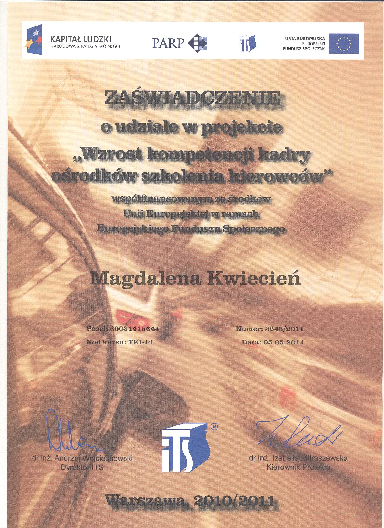 Instruktor z 30-letnim stażem w kształceniu młodych adeptów do prowadzenia pojazdów. Posiada on uprawnienia do kształcenia kursantów w kategoriach B, B+E, C, C+E.